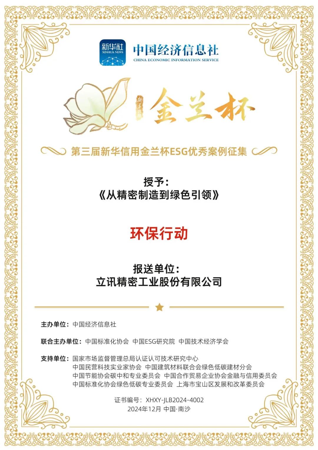 12月8日至9日,以“全球合作 绿色未来”为主题的2024年明珠湾国际气候投融资大会在广州举办,会上,第三届新华信用金兰杯ESG优秀案例名单正式发布。立讯精密申报的《从精密制造到绿色引领》案例,凭借在低碳环保方面的卓越实践与成果,成功入选新华信用金兰杯—环保行动优秀案例。