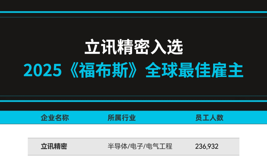 近日,全球权威财经媒体《福布斯》正式发布 2025 年全球最佳雇主榜单,立讯精密成功入选。