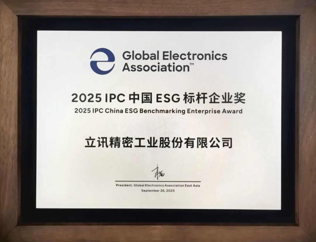 9月26日,IPC国际电子工业联接协会与上海市浦东新区质量技术协会联合主办的 2025 IPC CEMAC电子制造年会在上海落幕。本届大会以“共塑可持续未来(Shaping a Sustainable Future)”为主题,汇聚众多国内外电子制造企业代表、专家学者,共同探讨行业发展经验与前沿趋势,对在ESG领域做出杰出贡献的众多企业予以表彰,并发布了多项重要成果。立讯精密凭借在ESG领域的卓越表现,荣获“2025 IPC 中国ESG标杆企业奖”,且与多方联合发起电子行业ESG合作倡议,加入东亚区可持续发展指导委员会。