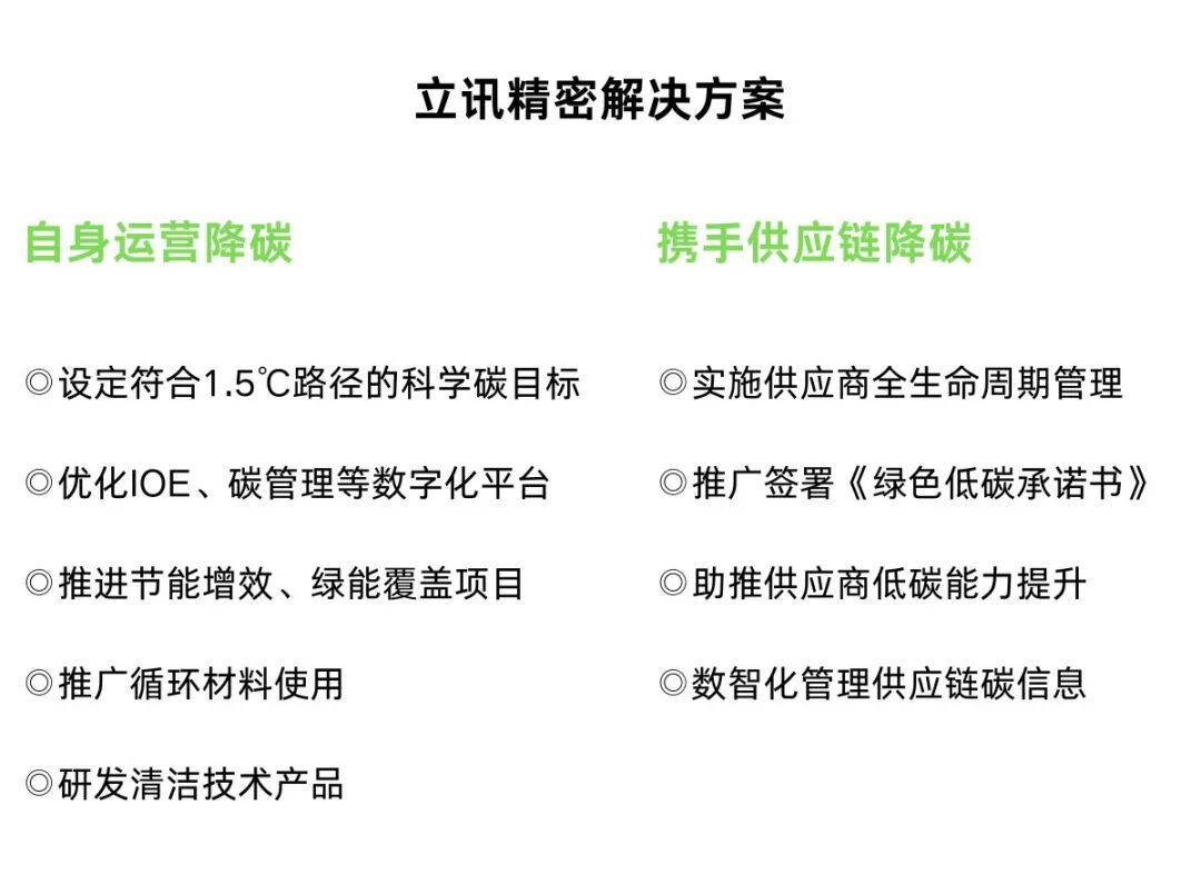 面对日趋严格的气候合规要求及供应链碳核算复杂、转型资源受限与企业自主转型意识薄弱等挑战,立讯精密在科学碳目标与集团碳中和路线图指引下,依托数字化管理工具(绿色供应链管理系统)与信息披露平台(IPE平台),持续优化供应商低碳管理体系,并以自身实践为供应链提供示范范式,共享经验与成果,夯实供应链去碳化基础。
