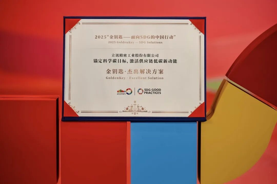 11月28日,“金钥匙——面向SDG的中国行动”年度盛典在北京圆满落幕。立讯精密连续三年在“双碳先锋”赛道展现出卓越领导力,申报的“锚定科学碳目标,激活供应链低碳新动能”案例,经过初评筛选、路演展示等环节,荣获2025“金钥匙·杰出解决方案”。