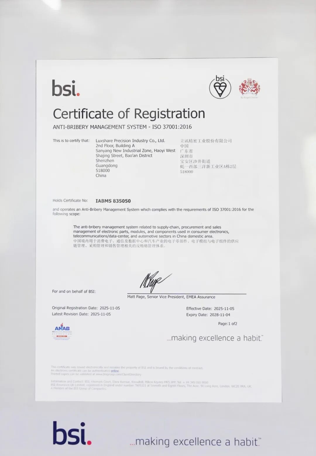 12月9日,全球权威标准机构英国标准协会(BSI)正式向立讯精密颁发了ISO37001:2016反贿赂管理体系认证证书。这标志着立讯精密深化廉洁建设、推进可持续发展征程,迈出了坚实且关键的一步。