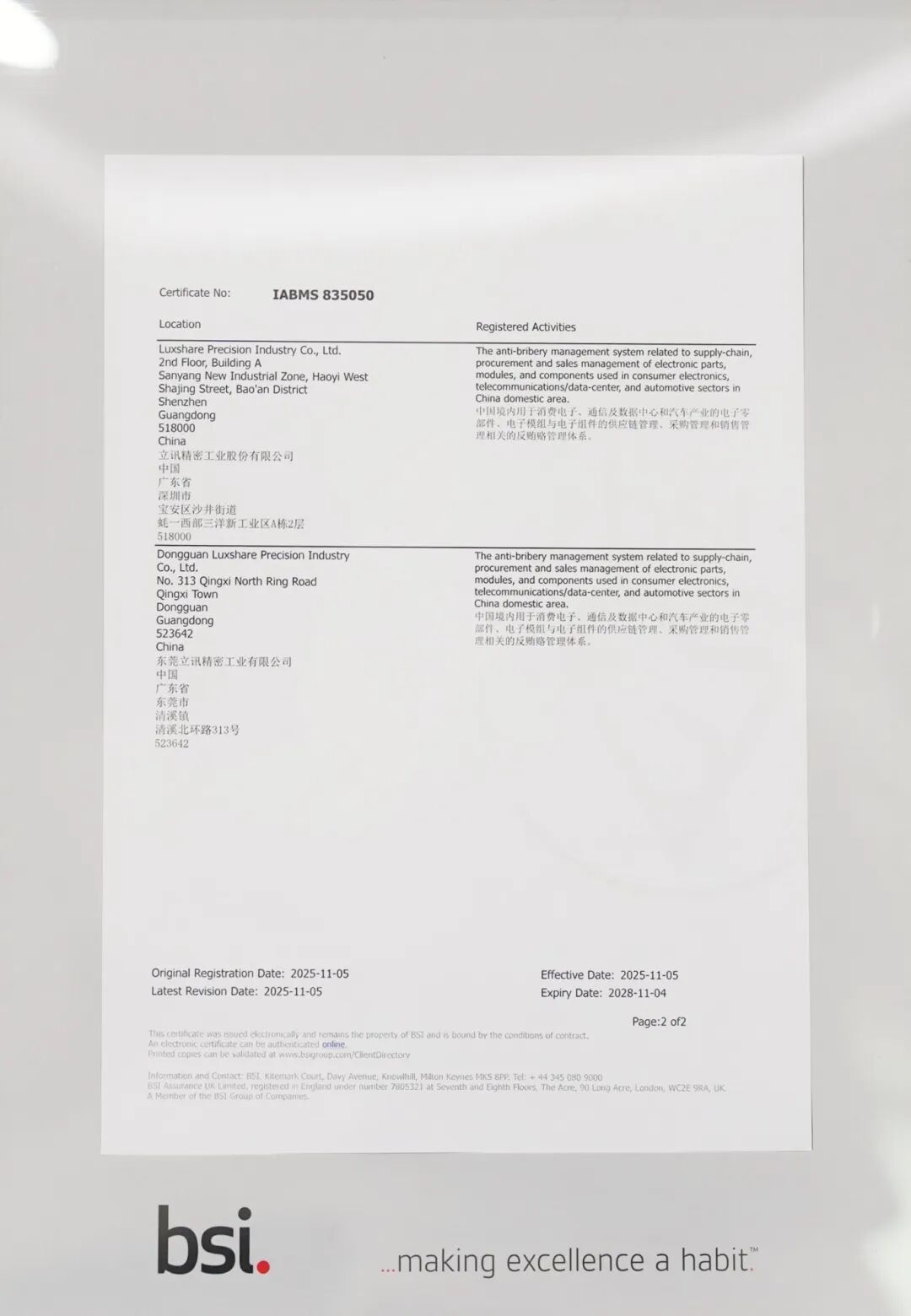颁证仪式上,BSI大中华区总经理塔缇阿娜·施莫拉克—塔拉索娃女士亲自将ISO 37001反贿赂管理体系认证证书递交至立讯精密可持续发展推进中心总监林道锋手中,并对公司重视反贿赂管理,通过防范和控制风险,确保高质量发展给予了高度认可。她表示,立讯精密在2025年高质量完成了体系标准化工作,并取得了完美的“零不符合项”的优异审核成绩,彰显了贵司在反贿赂管理领域的卓越表现,也为行业的可持续发展树立了标杆。